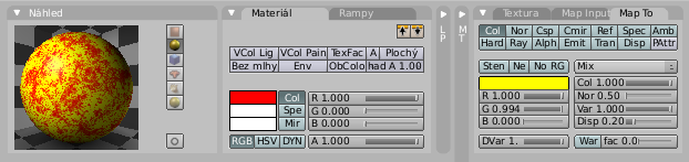 Teď přepněte zpátky na materiály. A nastavte červenou barvu. V tom okýnku úplně vpravo dejte Map to a tam nastavte žlutou barvu. Mělo by to vypadat takto: