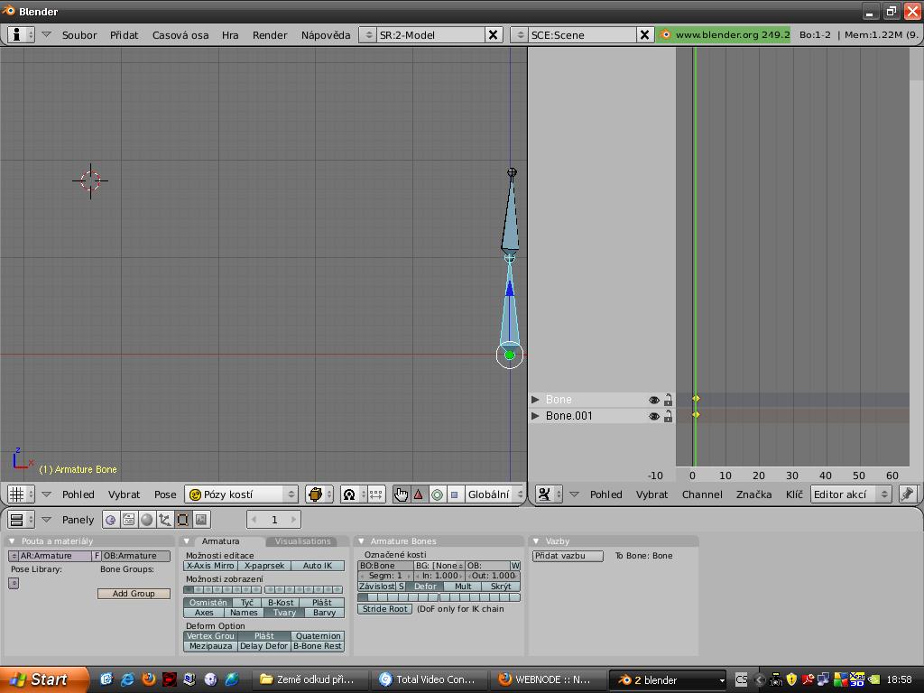 V editačním módu můžete přidávat další kosti stisknutím klávesy E. Rozdělte si okno na 2 poloviny a u jedné dejte editor akcí.