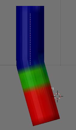Teď označte první trubku a pak kosti a stiskněte Ctrl+P>Kostra>Create from bone head a teď když označíte kosti a přepnete do módu Pózy kostí tak se bude trubka chovat podle kostí, ale vertexy se přiřadily jen přibližně. Můžete to upravit v módu Váha vertexů. Pracuje se zde štětcem, který přidává barvu (váhu) vertexům. Vyberte jméno kosti vlevo v pouta a materiály pod vertex group a štětcem upravujte. Nastavení štetce je uprostřed panel Kreslit weight nastavujete váhu, size - velikost, a tlačíka vpravo (jestli chcete váhu přidávat nebo ubírat). Já jsem si váhu nastavil takto: